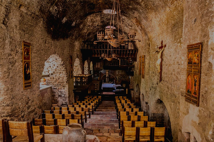 The open chapel, consecrated and in a style inspired by medieval theatre, stands out for its original design and solemn atmosphere. It is built with fine woods that bring warmth and character to the space, and features elegant balconies that frame the altar, creating a unique setting for special ceremonies.